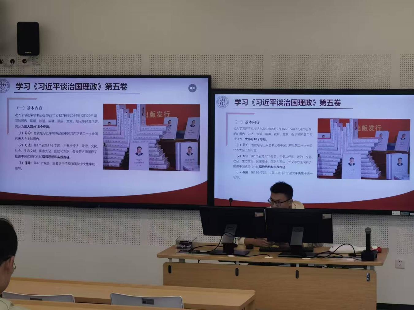 党支部宣传委员段要彬领学《习近平谈治国理政》第五卷。他系统介绍了著作核心内容与其中蕴含的新战略、新观点、新论断、新要求,提出可通过“目标-路径-保障”的逻辑框架深化理解。他强调,要深入学习钻研,切实以著作精神为指引,持续提升理论素养与党性修养。