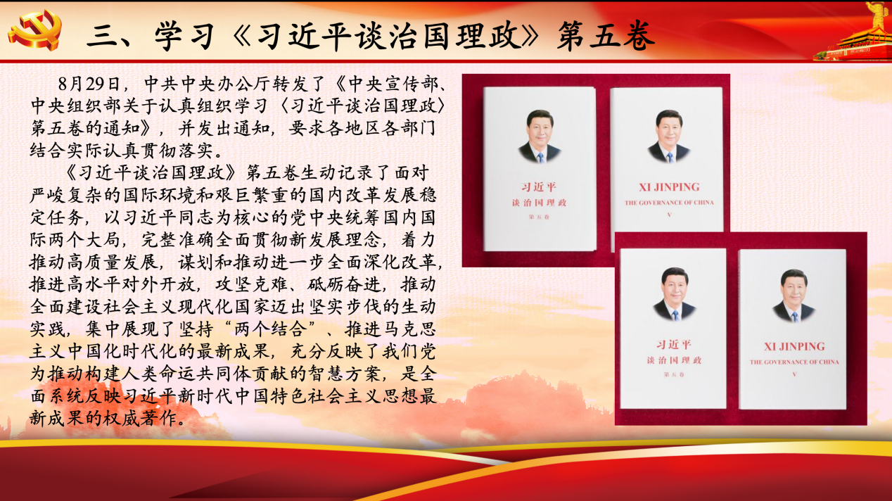 安邦源领学《习近平谈治国理政》第五卷,选取“坚持党的全面领导”“坚定不移走高质量发展之路”“扎实推进共同富裕”等章节进行阐释。她强调,《习近平谈治国理政》第五卷作为新时代治国理政的思想宝库,为学生党员提供了观察社会、分析问题的科学指引,需在反复研读中把握核心要义,将理论学习成果转化为指导实践的思想武器。