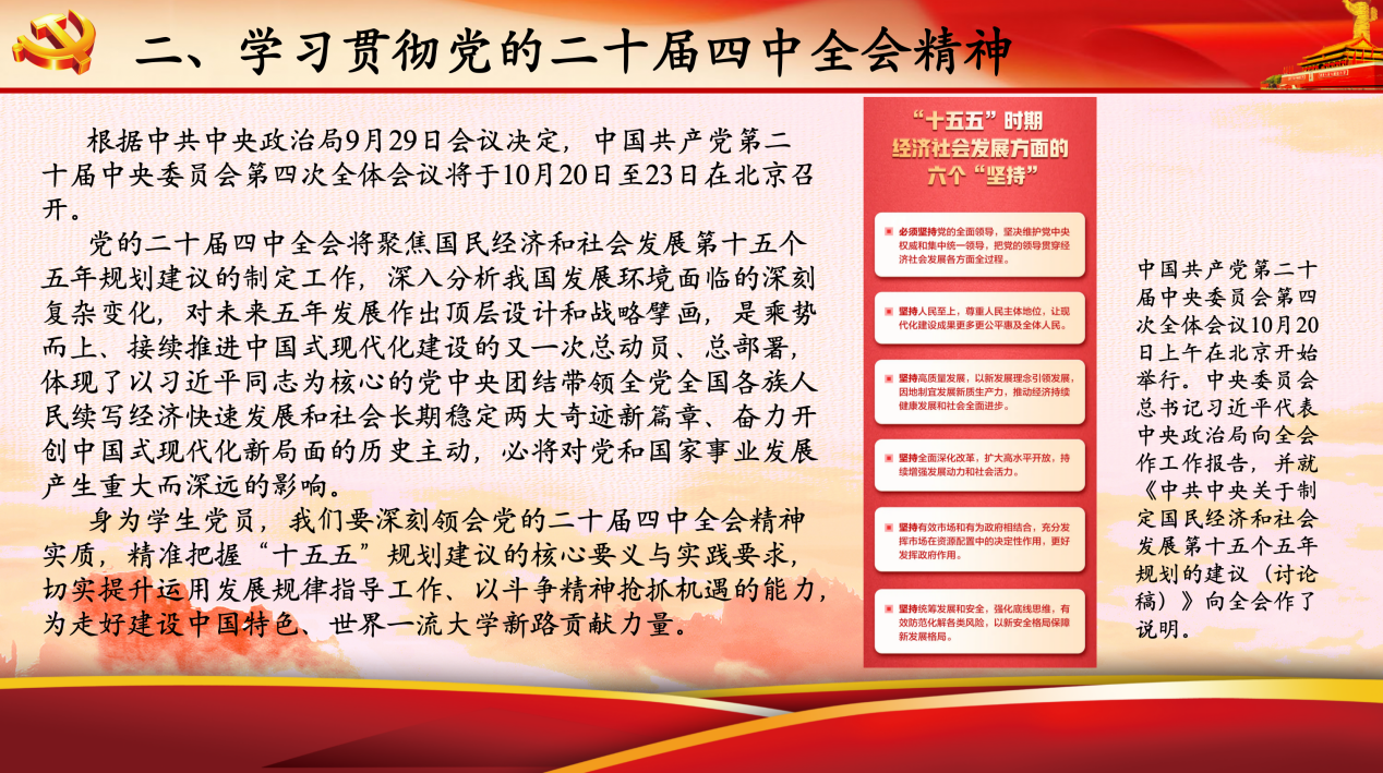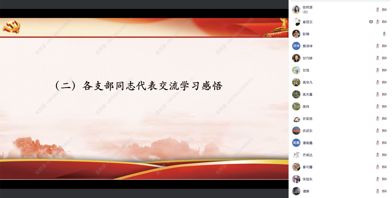 随后,安邦源领学党的二十届四中全会相关动态,通过收看权威媒体对会议议程、核心议题的即时报道,帮助党员直观把握 “十五五”时期经济社会发展、推进中国式现代化建设的战略方向。与会党员围绕“十五五”时期经济社会发展“六个坚持”进行研讨 ,大家一致认为应将国家战略需求与学术研究方向相结合,在公共政策分析、基层治理研究等领域主动对标全会要求,以专业能力服务国家治理现代化。